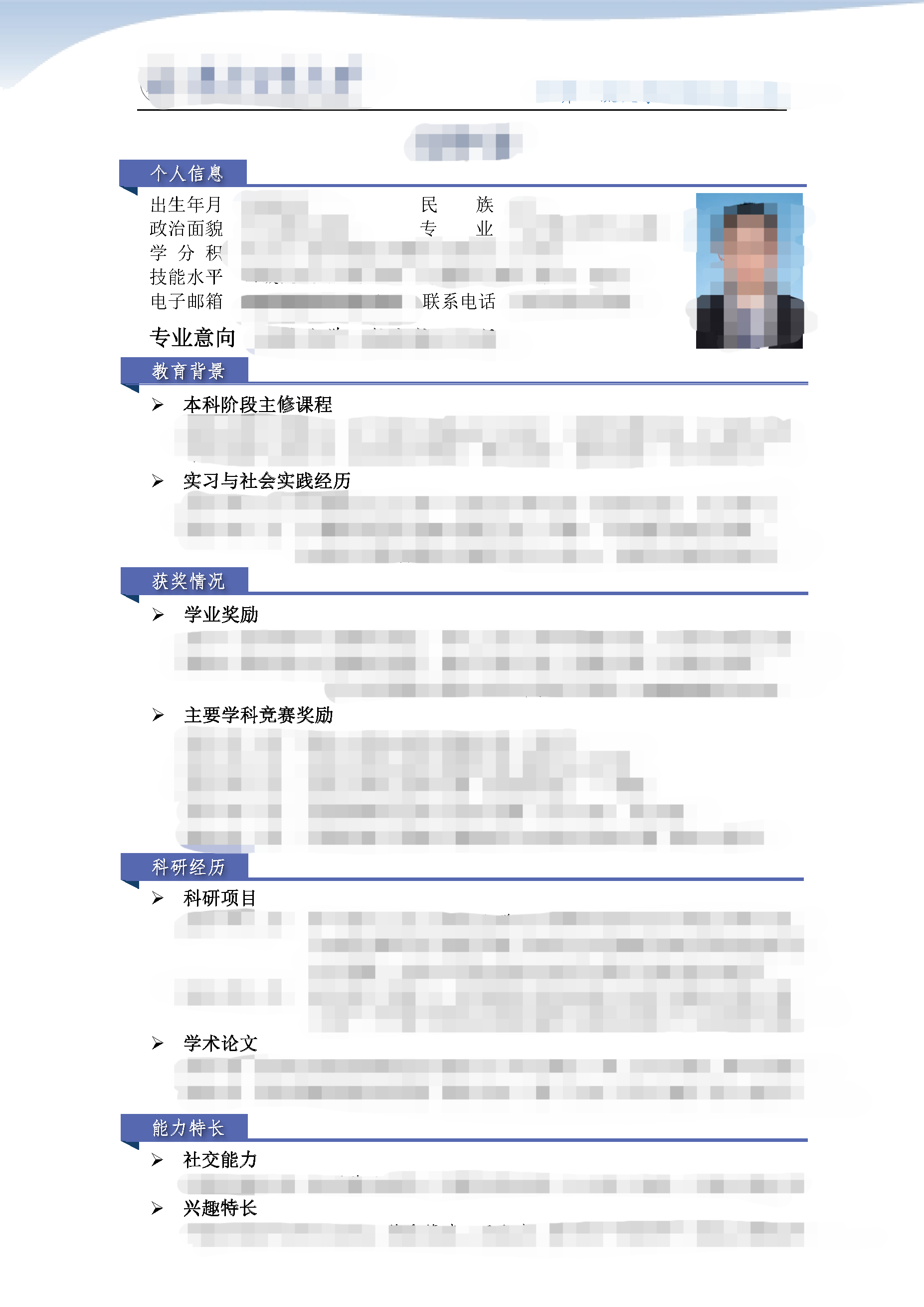 个人简历模板众多,但推荐以简洁精练为主,内容一般可以包括个人信息、教育经历、获奖情况、科研经历、能力特长等,也可以根据自己的特点、优势进行扩充。下面附我的简历供大家参考。