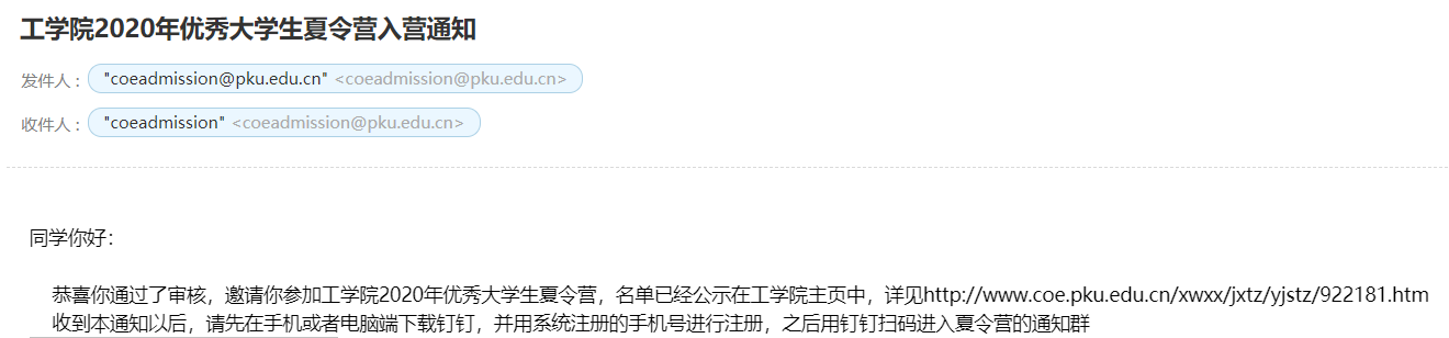 8月12日,工学院夏令营优秀营员名单公布,成功入选。
